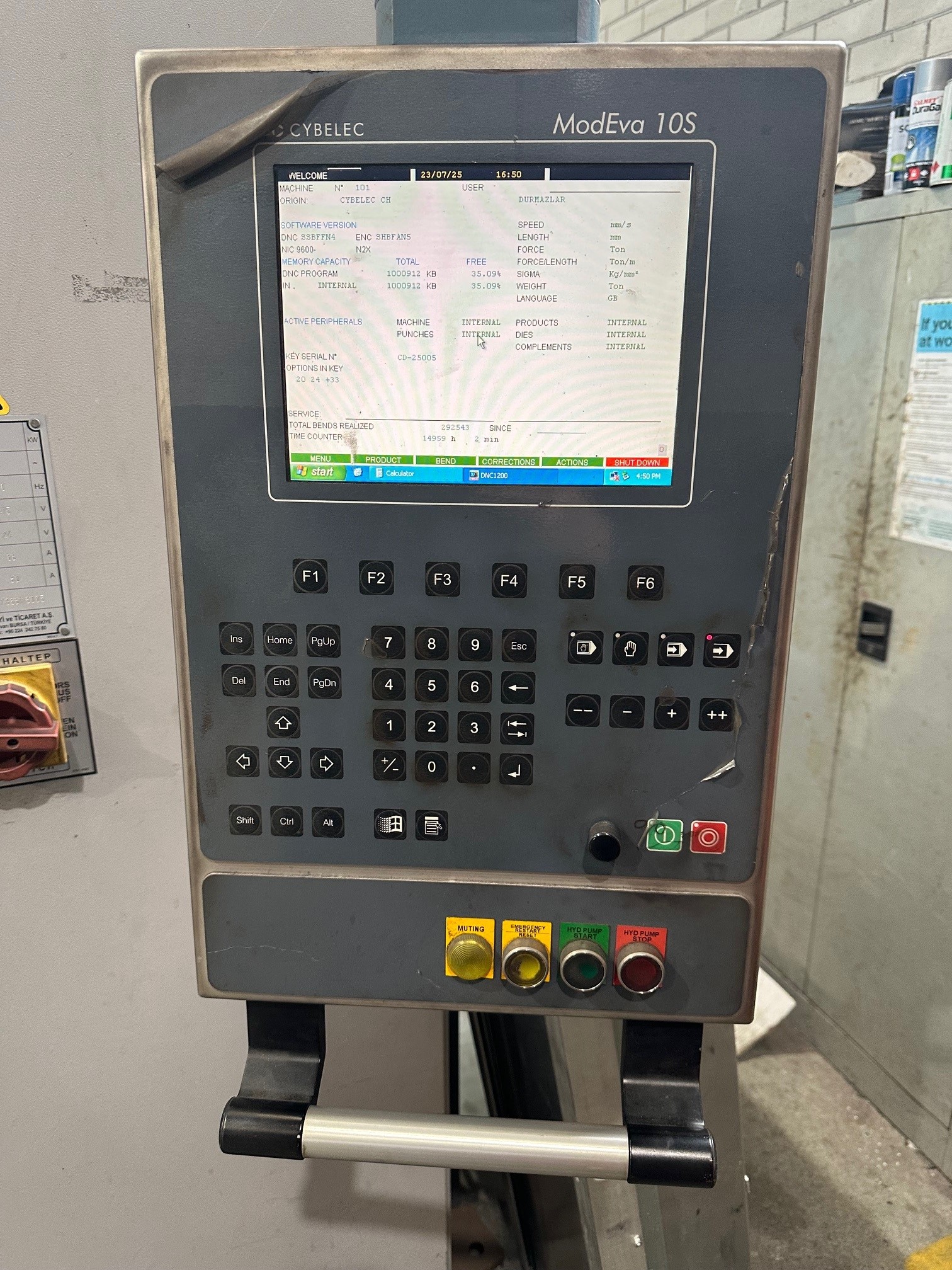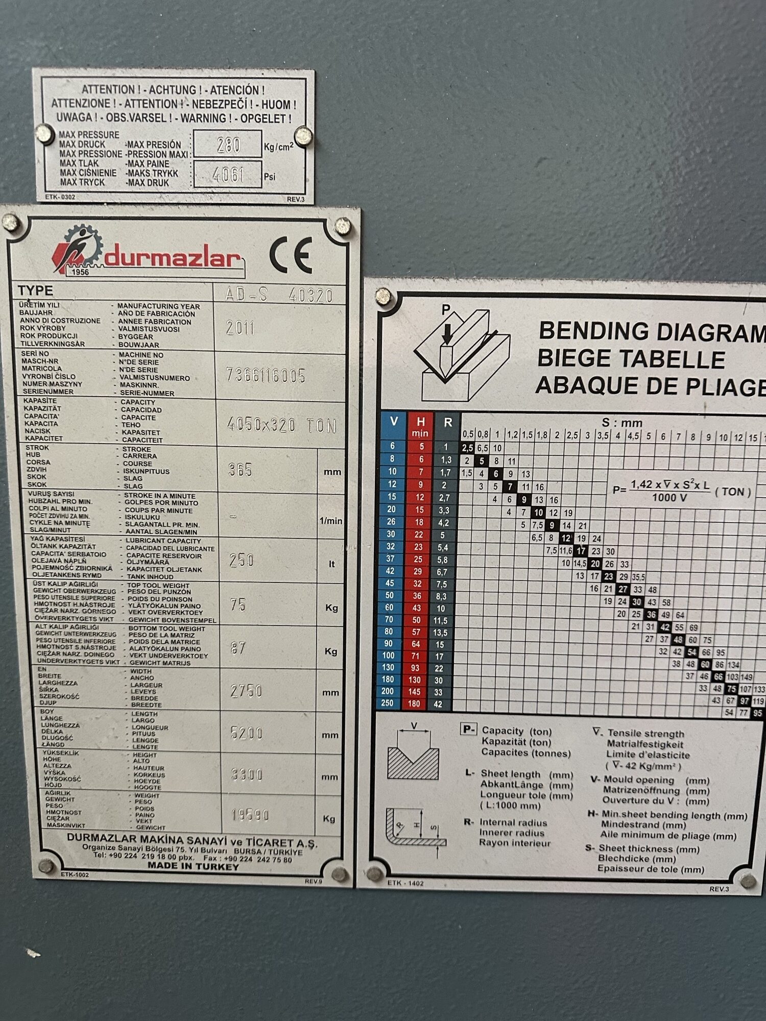 Used 2011 Durma 4Mtr x 320Ton Press brake with Cybelec Modeva10S CNC Controller.